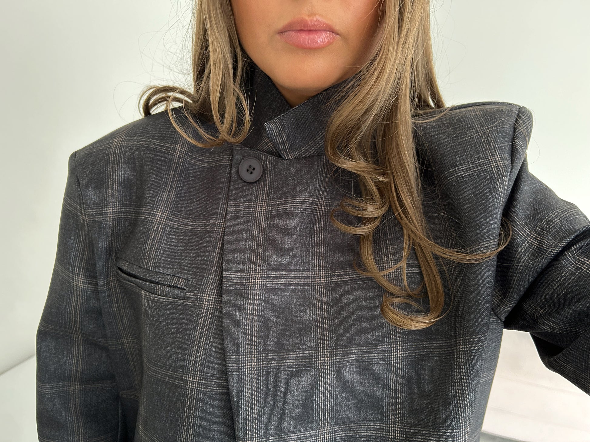 A sharp blazer in charcoal plaid with a clean collarless neckline. Effortlessly elevates any look, from denim to tailored pieces.